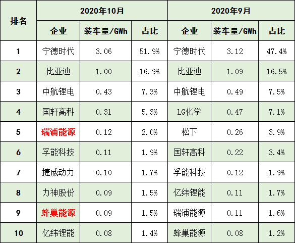 10月位居我国动力电池装车量排行榜前十的企业分别是:宁德时代、比亚迪、中航锂电、国轩高科、瑞浦能源、孚能科技、捷威动力、力神股份、蜂巢能源、亿纬锂能。